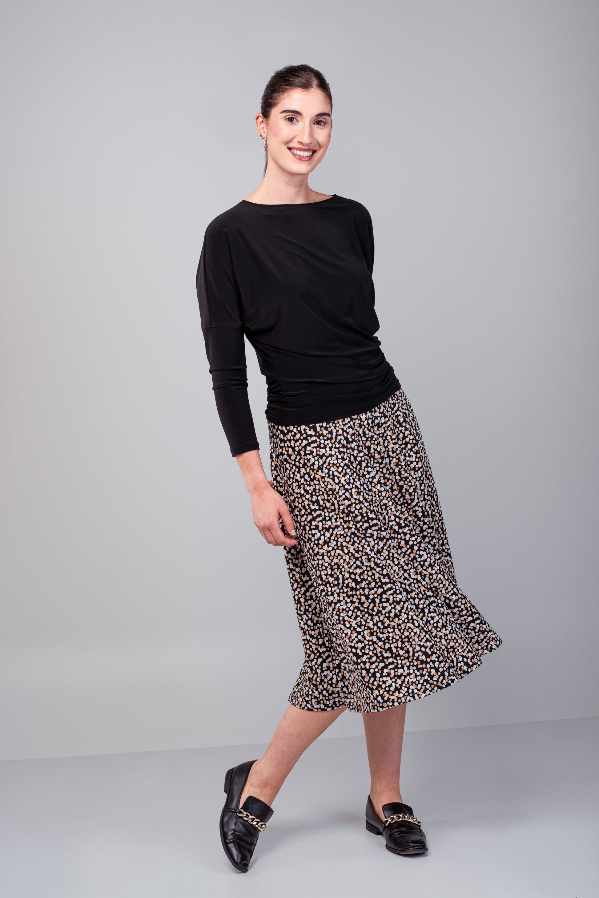 La jupe ample montrée sur la photo est disponible en différents imprimés et s'agence parfaitement avec le haut Brigitte.