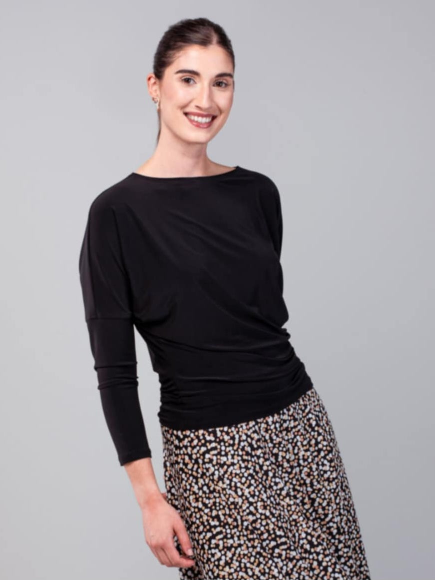 Le haut Brigitte est ample au niveau de la poitrine et des épaules, avec des manches longues. La coupe se rétrécit progressivement pour devenir ajustée aux hanches, ce qui permet d'en varier la longueur en plissant plus ou moins le bas du vêtement. Les fronces au côté font en sorte de camoufler les petites rondeurs s'il y a lieu.