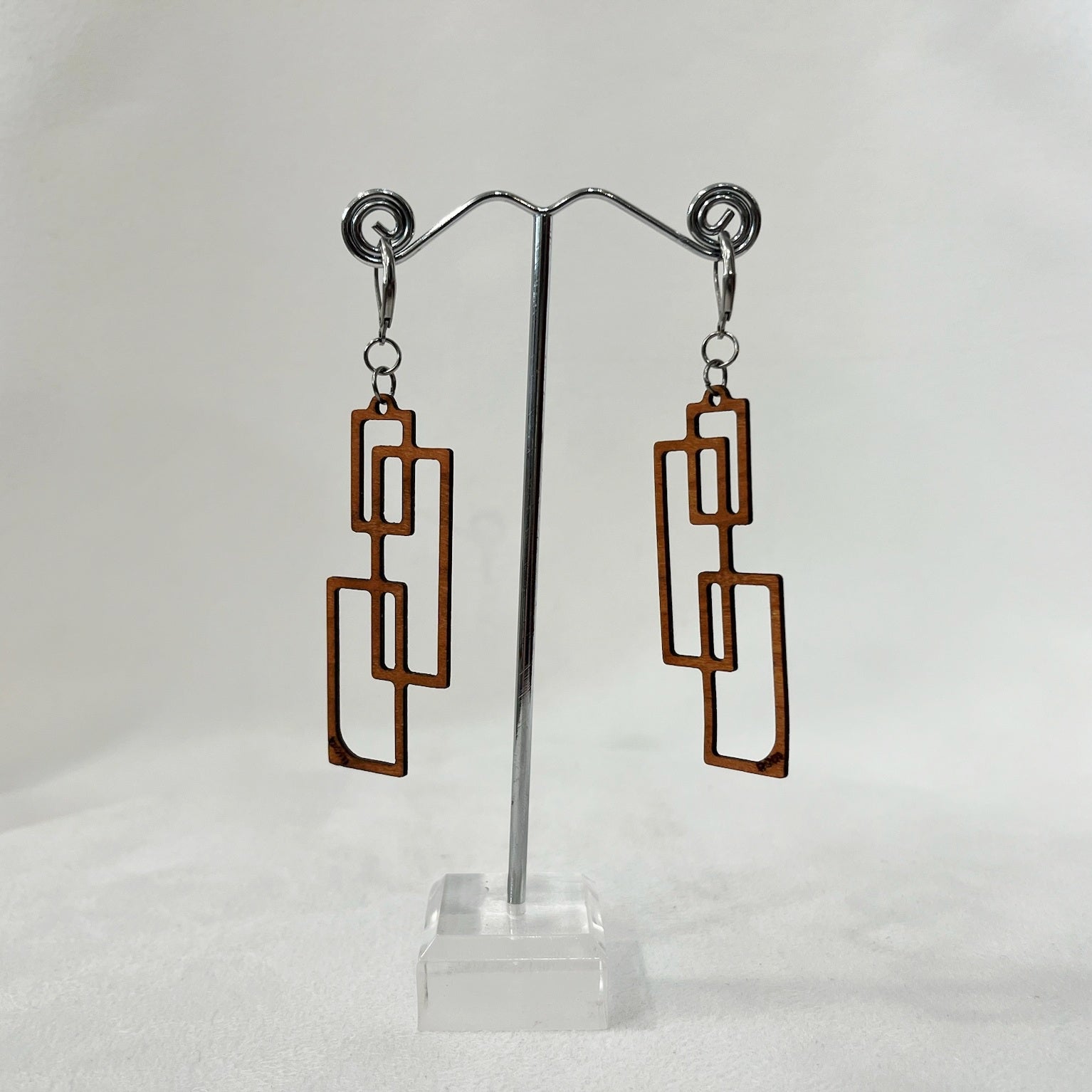 Les boucles d'oreilles Zanno 2 sont entièrement fabriquées à la main en placage de bois véritable. Elles sont traitées à l'huile pénétrante pour faciliter l'entretien. Elles sont montées sur un fermoir à levier en acier inoxydable. Ces boucles d'oreilles sont très légères, élégantes et modernes.