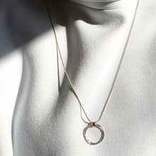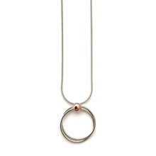 Le collier DOTS13 est composé d'une chaîne serpent en argent sterling de 32", d'un pendentif à deux anneaux entrelacés et d'une breloque en cuivre.