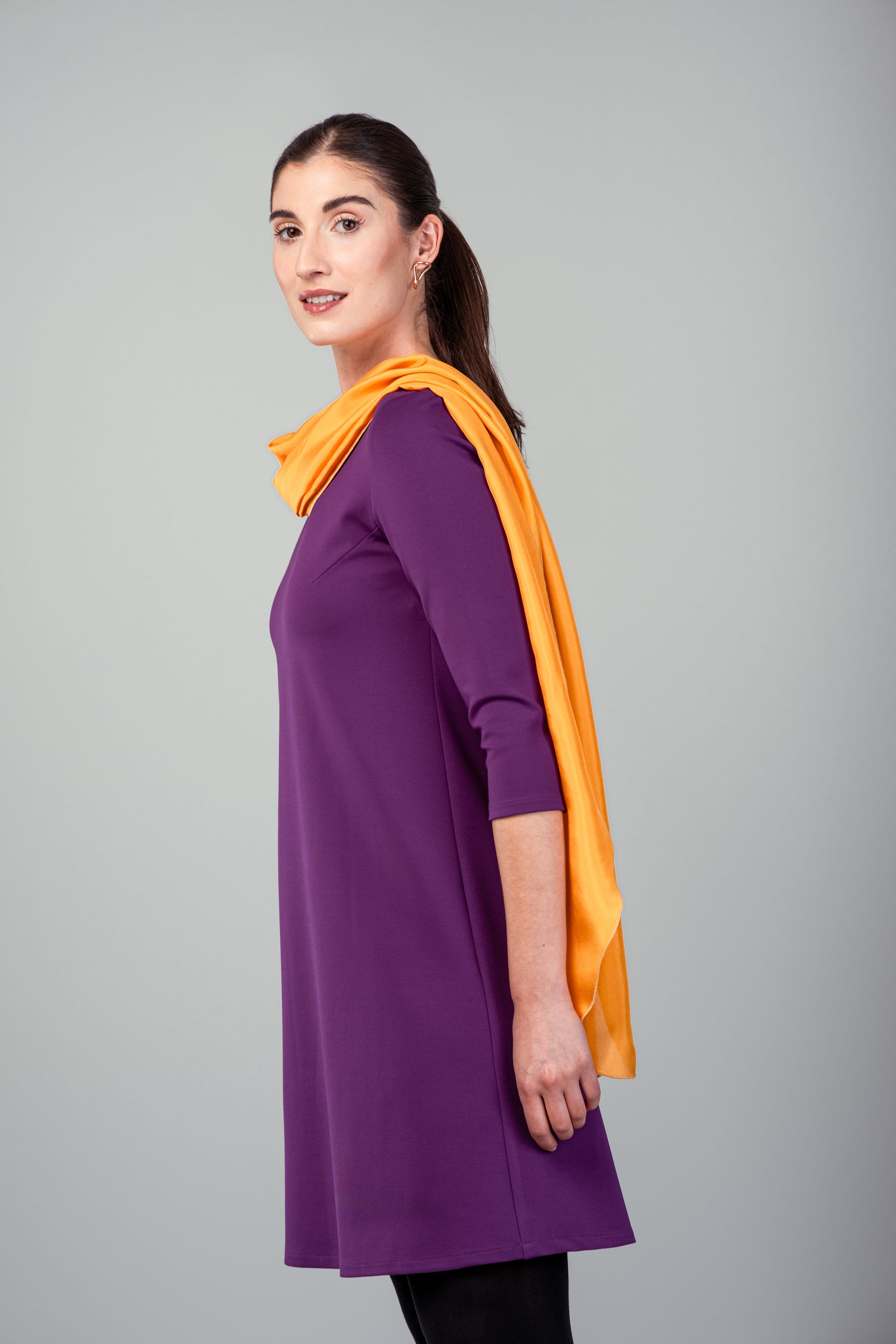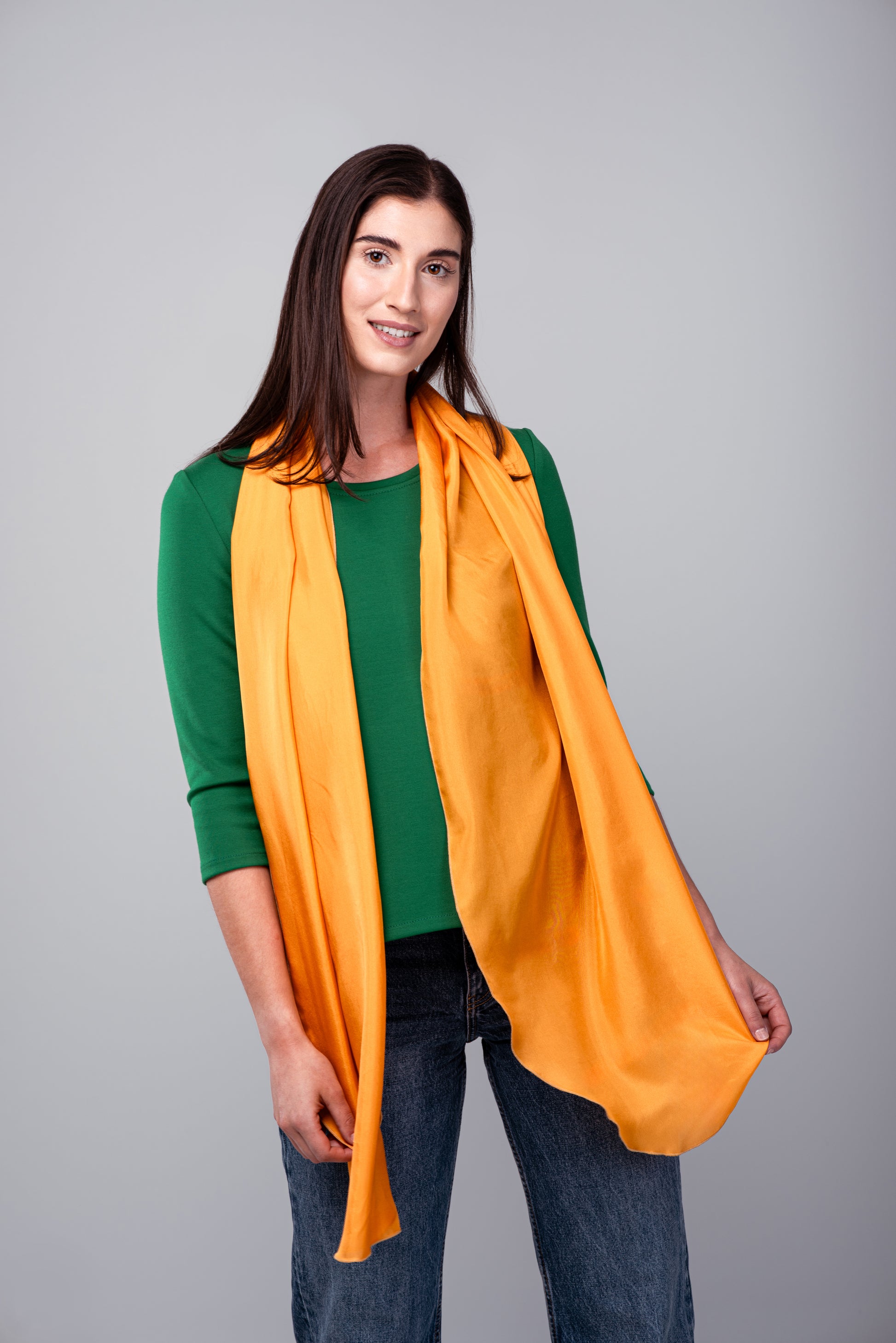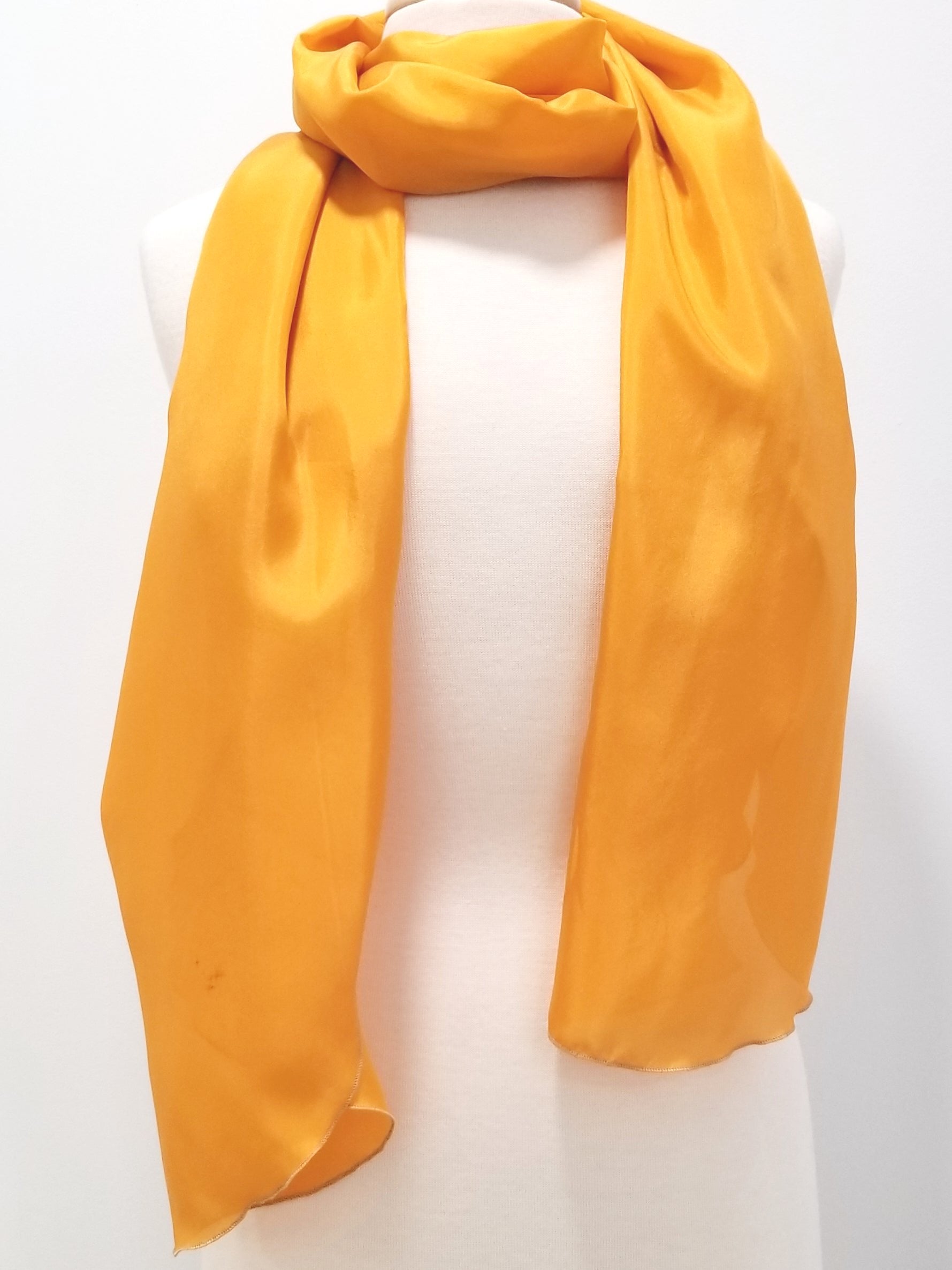 Ce foulard long en pure soie jaune, confectionné au Québec, allie élégance et légèreté. Polyvalent, il complet à merveille aussi bien un pull qu'un manteau, apportant une touche raffinée et colorée à votre tenue.