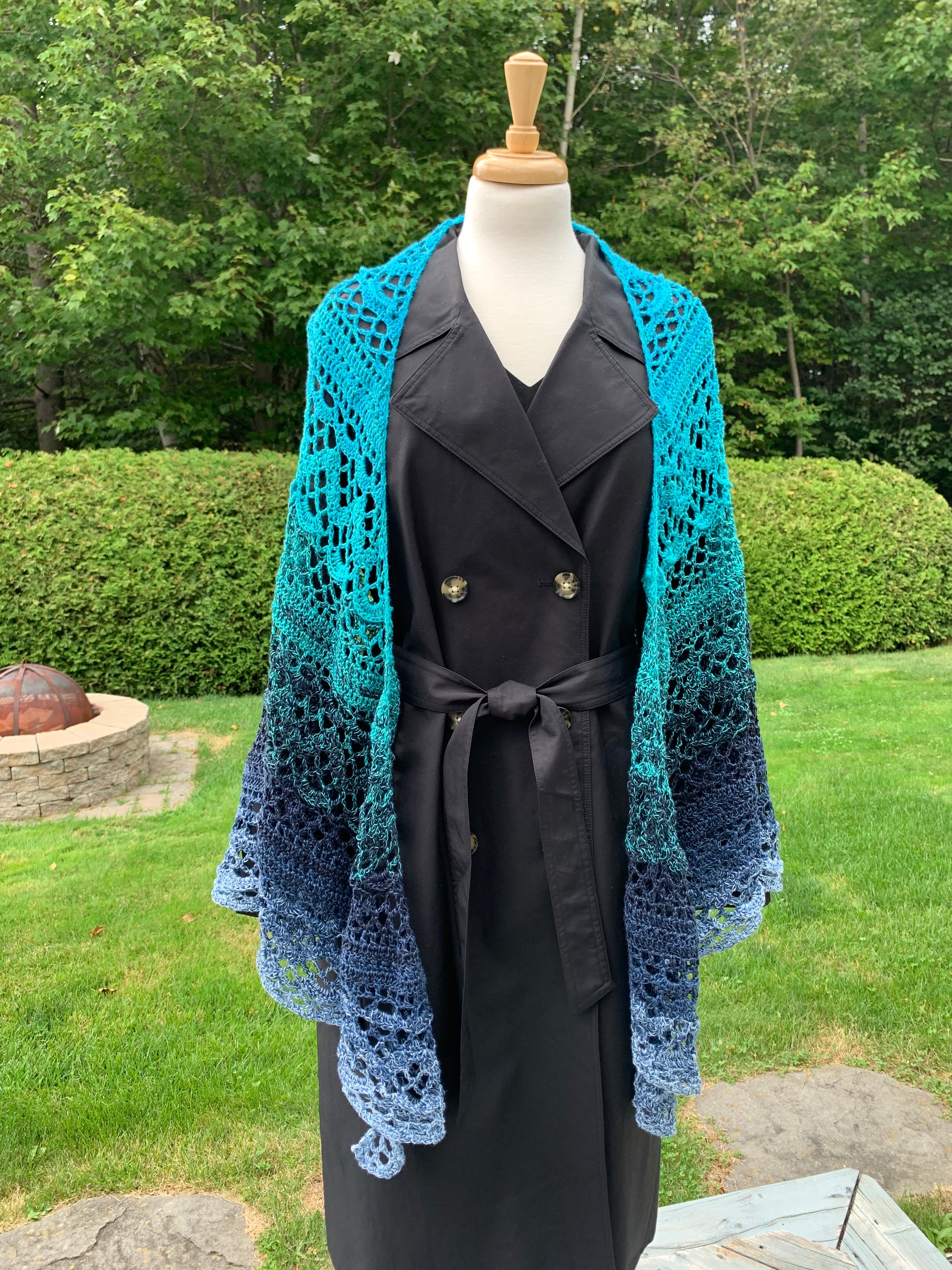 Grand châle triangle, dégradé en tons bleu et turquoise